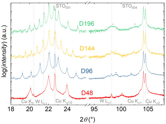 Symmetric () XRD scans for the samples of the -series (D48-D192). The gray dashed lines indicate the positions of the substrate STO () reflexes with Cu splitting, Cu , and W spectral line contributions as marked, the arrows indicate the positions of superlattice fringe peaks, and the asterisks the (004) superstructure peaks. The measurement on sample D48 was performed with a smaller step size and a four times longer integration time to improve the signal to noise ratio.