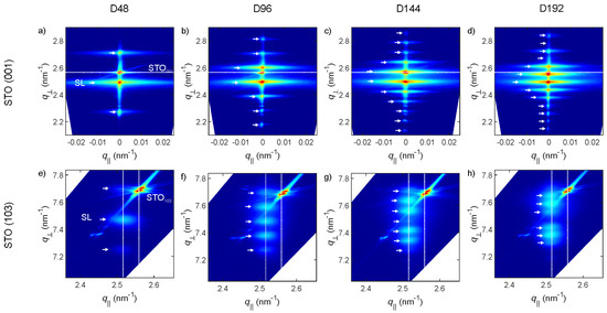 Reciprocal space map (RSM) around the STO 001 (a–d) and 103 (e–h) peaks for samples D48 (a,e), P96 (b,f), D144 (c,g), and D192 (d,i). The white arrows mark the positions of superlattice peaks, the horizontal line in (a–d) marks the out-of-plane position of the STO (001) peak, the vertical lines in (e–g) mark the in-plane position of the superlattice and STO (103) peaks, respectively, as labeled in (e).