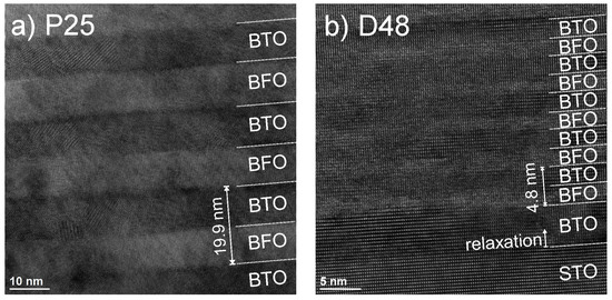 We performed high-resolution transmission electron microscopy (HR-TEM) measurements on a selection of samples to supplement our findings on double layer thickness, individual layer thickness, coherency, crystalline quality, and lattice constants. Two of the resulting microscopy images are presented in Figure 3a sample P25 and Figure 3b sample D48) and the measurement results are summarized in Table 3. The overall values determined from superstructure fringe peaks in scans, as well as the constituent layer thicknesses estimated by fitting XRR data match closely the values measured with TEM. Since this is the case for a representative cross-section of samples including the extremes of their respective series (highest, lowest, and standard BTO-BFO ratio, highest , and highest and lowest ), we conclude that the XRD measurement results obtained for the remaining samples are also reliably accurate. In particular the sample P25 adheres to the target values for and closely, which makes for an ideal standard sample for our investigations. Both P25 and D48 display atomically smooth interfaces (see Figure 3). The sample R09 with the highest BTO content exhibits a significantly increased amount of strain contrast, as well as an interface roughness in the nm-range (see Figure S6a, which is consistent with the increased FWHM of this sample. While the sample R01 with the lowest BTO content displays atomically smooth interfaces, HR-TEM images from this sample feature many spots of Moiré patterns indicative of misaligned grains forming small angle grain boundaries within the film, as well as strain contrast, see Figure S6b.