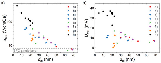 The explicit variation of with otherwise consistent deposition parameters and a 1:1 BTO-BFO thickness ratio leads a to roughly inverse dependency of on , as shown in Figure 5c. We reported similar dependencies based on the variation of the BFO layer only in [12,13]. For the thinnest sample D48, with each double layer consisting only of 6 unit cells each of BTO and BFO, an value of 480 Oe is obtained. This is the largest value recorded for any of our BTO-BFO multilayer samples and represents an increase of two orders of magnitude relative to the values reported for BFO single layers [13,19]. Note also that the ME voltage only slightly varies throughout the series.