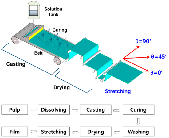Figure 1. In the casting process, the film was subjected to a sprinkled mixture of water and isopropyl alcohol. The film then passed through multiple rollers in the drying system. Near the end of the drying process, the film was stretched to have stretching ratios from 1.5 to 1.8. Aluminum electrodes were deposited on both sides of the film using a sputtering machine. After the fabrication, the films were cut to have an area of 40 mm × 12 mm, with three orientation directions with respect to the stretching direction, 0°, 45°, and 90°. For simplicity, we denote these orientations as θ0, θ45, and θ90, respectively. The film thickness measured was approximately 20 μm. The film samples then were taken for tensile testing and piezoelectric testing. A tensile tester (DTT-701C, Daekyung Tech, Incheon, Korea) with a linear scaler (GB-BA/SR128–015, Sony, Tokyo, Japan,) and a picoammeter (Model6485, Keithley, Solon, OH, USA) were used.