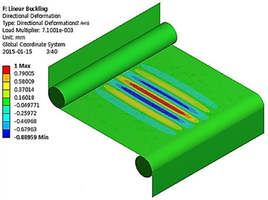 Table 1. Displacement boundary conditions are specified at two rollers associated with the velocity difference between two rollers. The alignment mismatch between the rollers induces the shear stress adding to the tension in the longitudinal direction. The wrinkles are inclined with an angle of 7.5° depending on the mismatch. The wavelength is found to be 26.86 mm. The out-of-plane displacement increases gradually from the edge while oscillating alternately and reaches its maximum near the center. The wrinkle at the bottom shifts its peak to the right while the wrinkle in the top shifts its peak to the left.