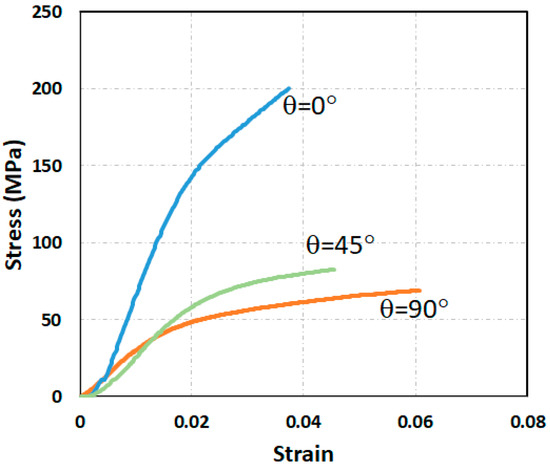 Figure 6 shows the stress–strain curves of stretched EAPap with the orientation of θ0, θ45, and θ90. At the very low strains (<0.005), the stress increased very slowly. The stress–strain relationship in this region resembles reversible nonlinear viscoelastic behavior. The stress afterward increases rapidly in a linear fashion in all three, θ0, θ45, and θ90 cases. The maximum tensile strength is shown in the θ0 case and the minimum value in the θ90 case. This orientation dependency of stretched EAPap may not be surprising given the re-alignment of the cellulose molecule chains which occurs during the stretching process.
