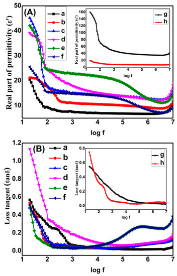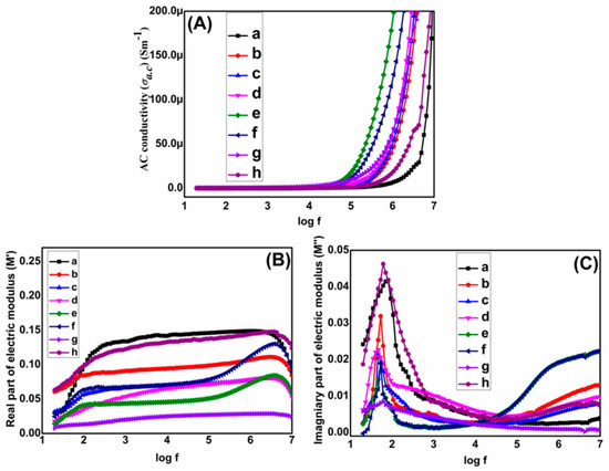 | Frequency (Hz) | Dielectric Permittivity (ε′) | Loss Tangent (tanδ) | AC Conductivity (σac) (Sm−1) | ||||||