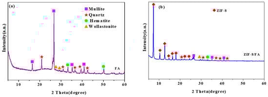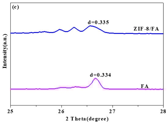 XRD patterns of FA and ZIF-8/FA samples are shown in Figure 2. It can be seen from Figure 2a that the FA raw material contains a large number of amorphous and crystalline substances, and the main crystal substances are mullite Al6Si2O13 (No.150776) and quartz SiO2 (No.461045). The characteristic peaks of the crystal phases of quartz and mullite are very significant, indicating that the crystallinity of the two is very good, which is consistent with the characteristic diffraction peaks reported in the literature [26]. The crystallite reflexes of hematite (No.521449) and wollastonite (No.420550) are also observed in Figure 2a. As shown in Figure 2b, after coating with ZIF-8, both peaks representing the FA phase and ZIF-8 phase could be found in the composite, indicating successful synthesis of the ZIF-8/FA composite. The (001), (002), (112), (022), (013), (222), (114), (233) peaks of ZIF-8 samples are obviously observed at 2θ = 7.33°, 10.41°, 12.75°, 14.73°, 16.43°, 18.07°, 22.17°, and 24.54°, respectively [21]. Figure 2c shows that the change in the d spacing of FA after coating with ZIF-8 is negligible and these signify the ZIF-8 nanoparticles are on the surface of FA. The average crystallite size of ZIF-8 on the surface of FA calculated by Scherrer equation (D = Kλ/(βcosθ) is 15.85 nm, where β = 0.00916 is the full width half maximum(FWHM) of the sample and θ is the diffracting angle, K = 0.94 is a coefficient, λ = 0.15418 nm is the X-ray wavelength [27].