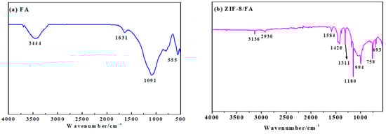 Figure 3 is the FTIR of FA and ZIF-8/FA powders. The bands at 500–555cm−1 were ascribed to Al–O stretching vibration and Si–O bending vibration of FA [27]. The bands at 1091 cm−1 corresponded with the Si–O–Si asymmetric stretching vibration adsorption peak [27]. The bands at 3444 cm−1 and 1631 cm−1 were attributed to the O–H stretching and bending vibration adsorption peaks of FA, respectively [27] (Figure 3a).