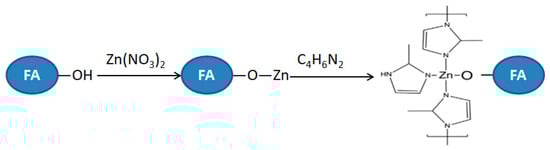 After coated with ZIF-8 (Figure 3b), both peaks representing the FA and ZIF-8 could be found in the composite. New infrared diffraction peaks at 3136, 2930, 1584, 1426 cm−1 are feature peaks of imidazole, and the infrared diffraction peak at 500 cm−1 is the peak of Zn-O telescopic vibration, which is consistent with the earlier published papers [28,29]. Moreover, the band at 3444 cm−1 disappeared and C-H stretching vibration adsorption peak of methyl and imidazole ring appeared in 3136 and 2930 cm−1 [28], respectively. The O–H bending vibration adsorption peak at 1631 cm−1 disappeared and C = N stretching vibration adsorption peaks appeared at 1584 cm−1. The bands at 1180 and 994 cm−1 show the C-N stretching vibration adsorption peaks [28]. In addition, the peaks at 1350–1500 cm−1 belong to the entire ring stretching. The in-plane bending of the ring are found at 900–1350 cm−1 while those below 800 cm−1 are associated with the out-of-plane bending of the ring [29]. Considering the above analysis, the preparation mechanism of ZIF-8/FA composites can be explained by Figure 4 [30].