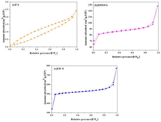 Nitrogen adsorption–desorption isotherms of (a) FA, (b) ZIF-8/FA, and (c) ZIF-8.