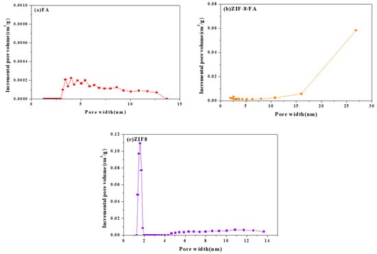 Pore size distribution of (a) FA, (b) ZIF-8/FA, and (c) ZIF-8.