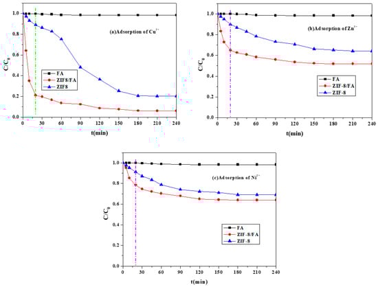 The adsorption results of FA, ZIF-8/FA, and pure ZIF-8 for removal of Cu2+, Zn2+, and Ni2+ are shown in Figure 7. It can be seen that after 4 h adsorption (the adsorption reached equilibrium), only 1.7 ± 0.2% (1.8 ± 0.3%, 1.6 ± 0.2%) and 79.8 ± 0.6% (35.9 ± 0.4%, 30.9 ± 0.3%) of copper (zinc, nickel) ions were adsorbed by FA and ZIF-8, respectively. Remarkably, more than 94.0 ± 0.5% (48.2 ± 0.4%, 36.1 ± 0.3%) of that could be adsorbed by ZIF-8/FA, revealing an advantageous synergy of adsorption between ZIF-8 and FA. Experiments also indicate that in the initial 20 min, ZIF-8/FA had faster adsorption rate of Cu2+, Zn2+, and Ni2+ than FA and pure ZIF-8.