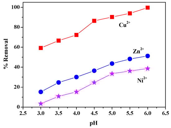 The relationship between removal rate of the ZIF-8/FA and the pH value is presented in Figure 8. In the preliminary test, we found that when pH value of the aqueous mixture is less than 3, some of the N-Zn bonds of ZIF-8/FA will break, while pH > 6, the heavy metal ions will precipitate with the free anion OH− in the aqueous solution. Therefore, these two ranges are not suitable for the study of ZIF-8/FA on heavy metal ions adsorption process. So the pH of the aqueous solution in the range of 3–6 was investigated. It can be seen from Figure 8 that the removal rate of heavy metal ions increases with the increase of pH value of the aqueous solution. With the increase of pH value of aqueous solution, the electrostatic revulsion among ZIF-8/FA surface and heavy metal ions decreased. When pH is low, the free H+ occupies the active site on the outer surface of ZIF-8/FA. By the increase of pH value, the H+ concentration decreased, the competitive relationship weakened, and the adsorption of heavy metal ions on the active site becomes larger, leading to an increased removal rate of heavy metal ions. Considering the above analysis, the pH value was selected as 5.5 in the next parallel experiment.