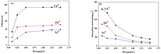 Effect of ZIF-8/FA dosage on (a) removal rate and (b) adsorption amount of heavy metal ions (heavy metal ions concentration:100 mg/L, 298K, 4 h, pH:5.5).