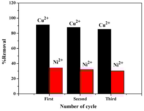 ZIF-8/FA composites were studied for the recycling experiments as reusability is an important factor for an adsorbent in practical application. Cu2+ and Ni2+ were used as representatives for recycling study (Figure 10). For cyclic runs, ZIF-8/FA composites were separated by centrifugation after the adsorption process and washed with 0.1 mol/L HCl and deionized water and dried for regeneration. Through these simple processes, the adsorbed Cu2+ and Ni2+ were washed out and the ZIF-8/FA composites were regenerated. Figure 10 is the recyclability of ZIF-8/FA composite for adsorption of heavy metal ions. It can be seen that the adsorption percentage of Cu2+ with ZIF-8/FA composites remained above 85% after three times of recycling test (91.2% for n = 1, 87.8% for n = 2, and 85.3% for n = 3) while that of Ni2+ with ZIF-8/FA composites remained above 30% after three times of recycling test (34.2% for n = 1, 32.1% for n = 2, and 30.4% for n = 3). Results of the recovery tests indicated that ZIF-8/FA composites can be employed as a potential adsorbent for the removal of heavy metal ions.