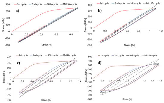 The hysteresis stress-strain loops of analyzed material for various levels of strain amplitude are presented in Figure 6a–e. The stabilized, mid-life cycle loops for different strain amplitudes are compared in Figure 6f. In all analyzed samples, the first cycles have lower values of both tensile and compressive stress comparing to the stabilized, mid-life cycle loops, which confirms that material undergoes hardening during the first stage of its fatigue life.