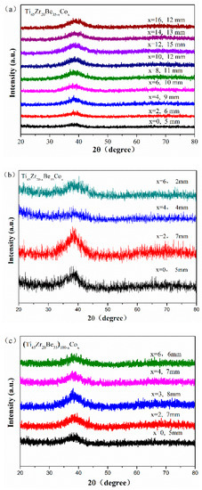 XRD patterns of as-cast. (a) Ti45Zr20Be35−xCox (x = 0, 2, 4, 6, 8, 10, 12, 14, and 16), (b) Ti45Zr20−xBe35Cox (x = 0, 2, 4, and 6), and (c) (Ti45Zr20Be35)100−xCox (x = 0, 2, 3, 4, and 6) sections with their critical diameters.