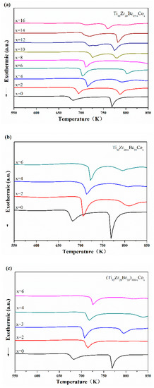 DSC curves of (a) Ti45Zr20Be35−xCox (x = 0, 2, 4, 6, 8, 10, 12, 14, and 16), (b) Ti45Zr20−xBe35Cox (x = 0, 2, 4, and 6), and (c) (Ti45Zr20Be35)100−xCox (x = 0, 2, 3, 4, and 6) samples with different heating rates.