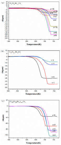 TMA results of (a) Ti45Zr20Be35−xCox (x = 0, 2, 4, 6, 8, 10, 12, 14, and 16), (b) Ti45Zr20−xBe35Cox (x = 0, 2, 4, and 6), and (c) (Ti45Zr20Be35)100−xCox (x = 0, 2, 3, 4, and 6) samples.