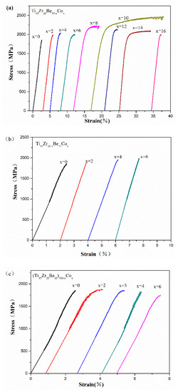 Compressive stress-strain curves of (a) Ti45Zr20Be35−xCox (x = 0, 2, 4, 6, 8, 10, 12, 14, and 16), (b) Ti45Zr20−xBe35Cox (x = 0, 2, 4, and 6), and (c) (Ti45Zr20Be35)100−xCox (x = 0, 2, 3, 4, and 6) samples.