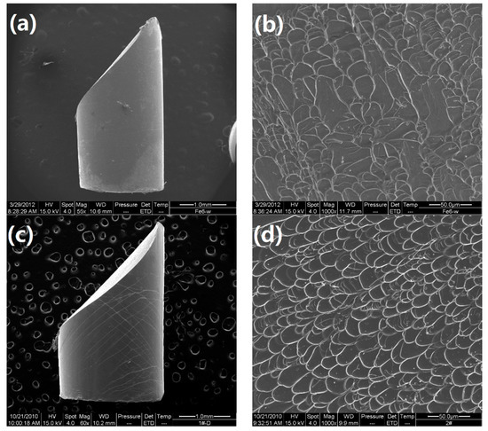 SEM images of fractured samples: (a) The lateral surface for the Ti45Zr20Be35 alloy; (b) the fractured surface for the Ti45Zr20Be35 alloy; (c) the lateral surface for the Ti45Zr20Be25Co10 alloy; (d) the fractured surface for the Ti45Zr20Be25Co10 alloy.
