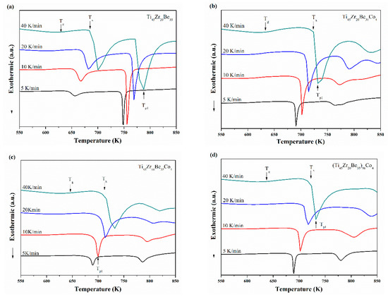 Continuous DSC curves for (a) Ti45Zr20Be35, (b) Ti45Zr20Be31Co4, (c) Ti45Zr16Be35Co4, and (d) (Ti45Zr20Be35)96Co4 BMGs.