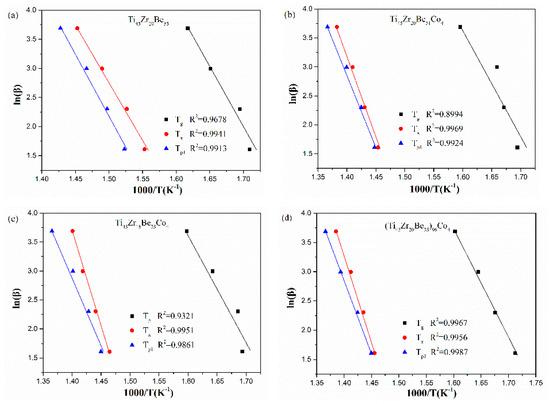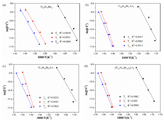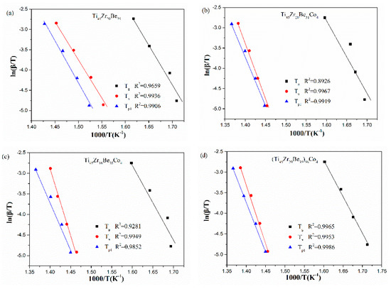 Kissinger plots for (a) Ti45Zr20Be35, (b) Ti45Zr20Be31Co4, (c) Ti45Zr16Be35Co4, and (d) (Ti45Zr20Be35)96Co4 BMGs.