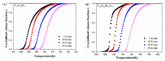 Figure 12 shows the values of x for the first crystallization event as a function of temperature for Ti45Zr20Be35, Ti45Zr20Be31Co4, Ti45Zr16Be35Co4, and (Ti45Zr20Be35)96Co4 BMGs. All the plots exhibit a typical sigmoid dependence on temperature, which is similar to that of other BMGs [54].