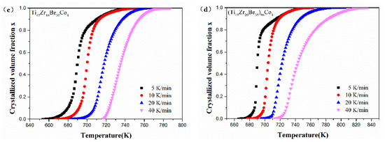 The crystallization volume fraction x as a function of temperature for (a) Ti45Zr20Be35, (b) Ti45Zr20Be31Co4, (c) Ti45Zr16Be35Co4, and (d) (Ti45Zr20Be35)96Co4 BMGs.