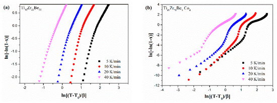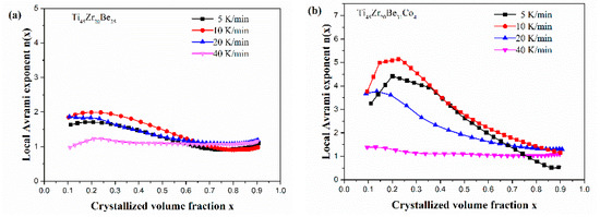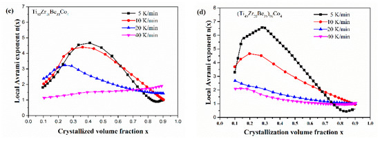 Figure 13 shows the JMA plots for the studied four alloys (0.1 ≤ x ≤ 0.9). Table 7 lists the calculated values of n. The calculated values of n for the Co-free alloy are close to or smaller than 2.5. Thus, the first crystallization event of the base alloy is mainly dominated by a growth of primary crystal type with decreasing/constant nucleation rate [52,53,54]. However, the values of n for the three Co-containing are relatively larger, implying that the crystallization mechanism is the growth of small particles and the nucleation rate increases with time [52,53,54]. Compared with the base alloy, the Co-containing alloys possess higher values of n, implying that the addition of Co increases the nucleation rate. Among the three Co-containing alloys, Ti45Zr20Be31Co4 alloy possesses the largest average value of the Avrami exponent, indicating that this alloy possesses the highest nucleation rate. As the JMA plots shown in Figure 13 do not exhibit a single slope, the n(x) of the studied four alloys has also been studied to further understand the crystallization mechanisms (as shown in Figure 14). For the base alloy, the n(x) changes little during the crystallization process. However, with the addition of Co, the values of n(x) and variance amplitude of n(x) during the crystallization process both increase obviously. The n(x) of Co-containing alloys also exhibit a stronger dependence on the heating rate compared with the Co-free alloy. Thus, the crystallization becomes more complex with the addition of Co, which contributes to the improvement of GFA.