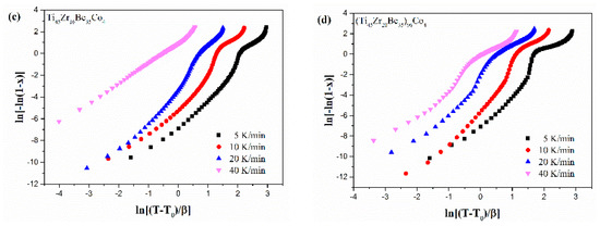 JMA plots for (a) Ti45Zr20Be35, (b) Ti45Zr20Be31Co4, (c) Ti45Zr16Be35Co4, and (d) (Ti45Zr20Be35)96Co4 BMGs (0.1 ≤ x ≤ 0.9).