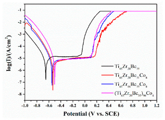 Potentiodynamic polarization curves of the Ti45Zr20Be35, Ti45Zr20Be31Co4, Ti45Zr16Be35Co4, and (Ti45Zr20Be35)96Co4 BMGs.