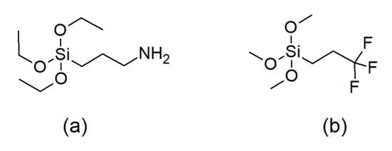 Structures of the silane coupling agents: (a) (3-aminopropyl)triethoxysilane and (b) (3,3,3-trifluoropropyl)trimethoxysilane.