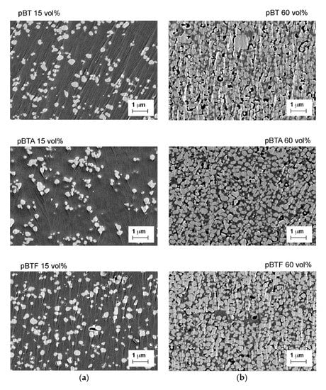 The cross-sections of the composites with 15 vol.% and 60 vol.% of barium titanate particles, pristine or surface-modified, are shown in Figure 3. The particles were generally well-dispersed in the matrix, although some larger agglomerates, which were also associated with local porosity, could be identified in all cases (as better visible in Figure S1, showing lower magnification FESEM images). Among the composites with 15 vol.% of ceramics, pBTF showed more voids located at the particle-matrix interfaces than pBT and pBTA. The morphology of composites with 60 vol.% of ceramics was confirmed to be similar to all types of particles. Overall dispersion of the particles was good, with few larger aggregates visible in all cases. Some porosity was also present for all composites, both at the interface with the particles and within the matrix: porosity was found preferentially in correspondence to the larger aggregates, or at the bottom side of the films, presumably because the solvent could less easily escape during evaporation. By image analysis, the porosity was estimated to be 7.5, 6.4, and 4.5 vol.% for composites with 60 vol.% of BT, BTA, and BTF particles, respectively. In our previous work, we had found by density measurements for composites fabricated with the same procedure about 16 vol.% porosity with BT particles, 11 vol.% porosity with BTA particles, and 9 vol.% with BTF particles []. Despite a slight difference in the absolute value given by the two methods, in both cases, it was confirmed that the porosity was low considering the high volume fraction of filler, and that the porosity difference with respect to surface modification was negligible.