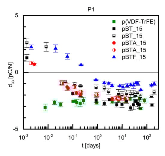Piezoelectric coefficient d33 as a function of time of P(VDF–TrFE) and of P(VDF–TrFE)/BaTiO3 composites with 15 vol.% of ceramic particles, poled with procedure P1.