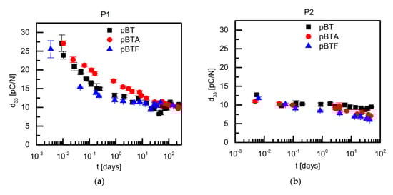 Piezoelectric coefficient d33 as a function of time of P(VDF–TrFE)/barium titanate composites with 60 vol.% of ceramics, poled with procedure P1 (a) and with procedure P2 (b).
