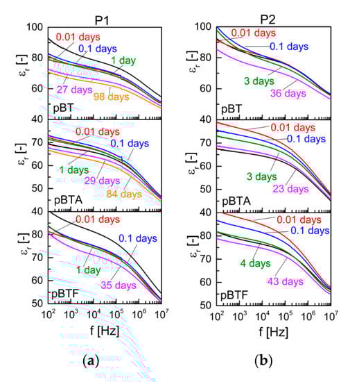 The position of the resonance peak appearing on the relative permittivity curves of samples poled with P1 did not evolve with time after poling. Indeed, the resonance frequency f is linked to the density and stiffness of the material by the relationship , where h is the linear dimension that determines the resonance frequency of the specimen, ρ is its density, and E is the effective elastic modulus []. In contrast, the height of the resonance peak (difference between permittivity at peak maximum and permittivity at peak minimum) decreased in time similarly to the d33, i.e. with a faster decay during the first day for the pBT composite, and a constant logarithmic decay in time for the pBTA composite. For the composites poled with P2, the resonance peak was barely visible as of the first measurements, due to the rather low d33 showed by those samples, and no further analysis was possible.