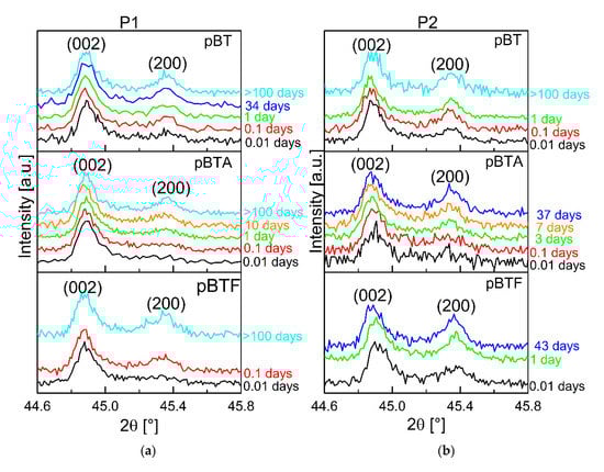 The XRD analysis gives insights regarding the poling degree of the BT particles inside the poled composites. For all composites, a decrease of the poling degree of barium titanate was observed. Diffractograms for the composites with 15 vol.% of ceramic particles are given in the supporting information (Figure S5). Selected diffractograms taken at different times from poling for composites with 60 vol.% of ceramic particles are shown in Figure 7. Firstly, the composites poled with P1 showed better poling of the barium titanate particles with respect to their homologs poled with P2. Poling consists of the reorientation of dipoles in P(VDF–TrFE) and of domains in BaTiO3. In a 0–3 composite, the poling field felt by BaTiO3 particles is screened by the polymer; therefore, it is smaller than the applied field. So, a long time is needed to orient as many domains as possible. In the P1 procedure, the electric field was applied also during cooling, so for a longer time than in the P2 procedure. If the poling field is removed at a high temperature, as done in P2, those domains that were oriented will tend to randomize because of the high thermal energy, and the sample will partially depole. Secondly, for both poling procedures, the barium titanate particles showed a marked depoling with time, indicated by the decrease of the I002/I200 ratio; the depoling rate was higher than expected based on the aging of poled barium titanate ceramics []. As a possible explanation, one can consider that aging of BaTiO3 is usually studied on samples with metallic electrodes. In these conditions, the polarization at the surface is completely screened: ideally, there is no depolarizing field, or it is relatively small. In the case of a 0–3 composite, this electrical boundary condition is completely different. The concentration of screening charges on the interface may be much smaller than for barium titanate with metallic electrodes, hence the depolarizing field inside particles may be larger, leading to faster depolarization. Finally, as it can be inferred by comparing the diffractograms taken at similar times for homologs, composites poled with the two procedures, the rise of the 200 peak, indicating depoling of BT, was faster for the composites poled with P2 than for those poled with P1.