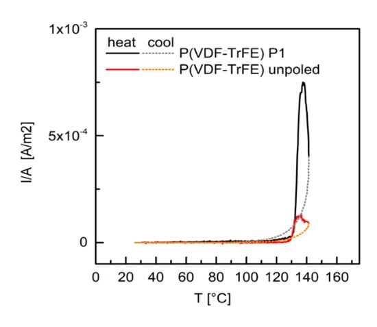 For both the unpoled and the poled P(VDF–TrFE) films, a discharge current was measured with an onset above 120 °C. The current intensity was much larger for the poled polymer. This current discharge, which at maximum was in both cases close to 137 °C, corresponded to the depoling of P(VDF–TrFE) at the Curie temperature. Upon cooling, a positive current intensity was still detected, which decreased to zero around 90 °C. This means that some poling was retained also after heating above the Curie temperature. For the poled P(VDF–TrFE) only, a small current discharge (of the order of 10-6 A/m2) was observed during heating from room temperature to 120 °C and may be related to trapped charges, most likely at the polymer–electrode interfaces.