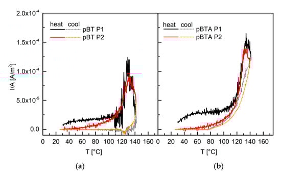 To better understand the role of charges in the mechanism underlying the different decay rate for d33 due to different modifications of the barium titanate particles, thermally stimulated discharge current analysis was carried out for the P(VDF–TrFE) not poled and poled with P1 (Figure 8), and for pBT and pBTA composites with 60 vol.% of ceramic particles (the pBTF composites were considered to behave similarly to the pBT ones), poled with P1 and P2 (Figure 9). When discussing these results, one should bear in mind that charges in these materials may have two origins: one from the polarization of barium titanate and of P(VDF–TrFE), and the other from trapped charges at interfaces. Depoling of barium titanate and P(VDF–TrFE) happens at their Curie temperatures (both around 130 °C), while trapped charges in general get released dominantly at the temperature of poling. In this case, the temperature of poling (110 °C) and the Curie temperatures are close, and these peaks may overlap.