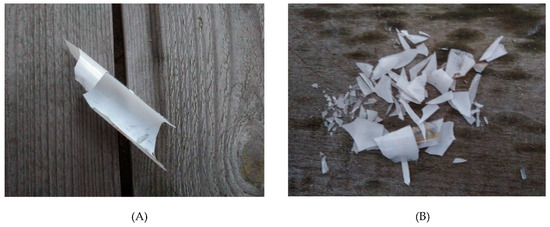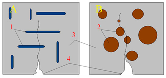 Scheme of the crack propagation and destruction of the middle part of the samples during the bending test of the composite: (A) crack propagation in a composite containing flat grains; (B) crack propagation in a composite containing round grains. Marks: 1—flat glass grains, 2—gravel grains, 3—binder resin, 4—propagating the crack. Flat grains located perpendicular to the propagating scratches are a kind of dispersed reinforcement improving the bending strength of the composite. In this process they are subject to stretching and protect against further crack propagation.