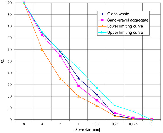 The aggregate obtained in this way was subjected to an analysis of basic properties [37,41,42,43,44], which is typically carried out for aggregates for cement concrete. The same tests were carried out on traditional sand and gravel aggregates. The first test performed for both types of aggregates was the assessment of the grain composition made according to EN 933-1: 2012 [41] by the sifting method. Figure 2 shows the sifting curves for glass aggregate and sand and gravel aggregate in the background of limiting curves. The sand–gravel mixture consisted of two grades: 0–2 mm and 2–8 mm, and its composition was determined by calculation method in which a sand point of 54% was assumed, which corresponds to suggestions in literature [37] for a mixture of grain size up to 8 mm.