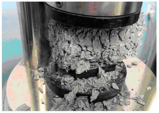 The most favorable compressive strength test results were observed for CONTR concrete, i.e., without glass content in its composition. The worst for the series were observed when the glass content of fluorescent lamps in the aggregate was 100%. Analyzing the results again, it was found that the addition of glass negatively affects the characteristics of concrete, and it is a linear relationship, i.e., that the higher the glass content from exemplary glass in the aggregate, the lower the compressive strength. It should be emphasized that the difference in extreme values was as much as 10-fold. The negative impact of glass from fluorescent lamps on the final compressive strength of concrete is visible. Referring to the concrete strengths of subsequent series, i.e., CG-10, CG-30, CG-50 and CG-100, CONTR concrete strength was estimated to mean that the percentage decrease in strength was 13.5%, 32.5%, 69.3%, and 90.8%, respectively. During the tests, some anomalies were also noted. Samples with the glass content were more damaged by peeling than cracking. A sample of CG-100 concrete during the compressive strength test is shown in Figure 4. This study also proved a concrete composite containing 30% recyclate retains a relatively high compressive strength—higher than 30 MPa—which classifies it as structural concrete.