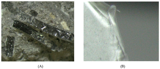 The last stage of the conducted research work was microscopic analysis, carried out using an optical microscope. These analyses were conducted in order to clarify the phenomenon of lowering the quality of concretes due to the addition of lighting glass. The glass material itself, tested by methods such as traditional cracks, showed advantageous features as aggregate. Microscopic analyses were planned to confirm one of the hypotheses regarding the increasing amount of air in concrete resulting from the addition of glassware. The first stage of microscopic analysis was the observation of phosphor-coated glass surfaces. Fragments of concrete samples after destruction became detached during the test. Figure 5A,B shows an enlarged glass aggregate grain in a leaven and in a close relationship to the surface structure, respectively.