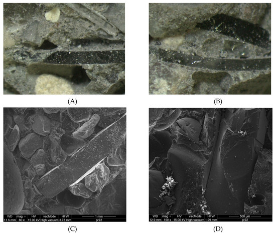 Two examples of grains of glass aggregate in leaven and air voids located in their close vicinity. Magnification: (A,B) 10x; (C) 80x; (D) 150x.