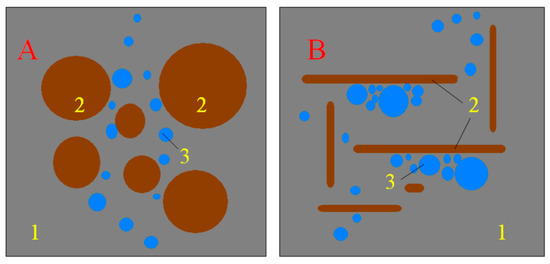 Scheme of air retention in a concrete mix during vibration. (A) Mixture with aggregate shaped, (B) mixture with flat aggregate. Markings in the drawing: 1—cement paste, 2—aggregate grains, 3—air bubbles moving upwards during vibration.