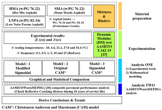 In this paper, the impact of different mathematical models used for generating master curves of dynamic modulus, on the predicted performance of rehabilitated concrete pavements subjected to asphalt overlay is investigated. First, three different asphalt mixtures widely used in South Korea such as HMA, SMA, and LNPA [29] are prepared and the dynamic modulus is experimentally measured [25]. Then, three different mathematical models, including a newly developed model, are selected to analyze the rheological properties of the tested asphalt mixtures. Finally, a commercial pavement analysis software, AASHTOWare-Pavement [30], is used to evaluate the effect of different asphalt materials and mathematical modeling on the performance prediction of composite pavement, including RC resistance. The research approach adopted in the present study is shown in Figure 1.