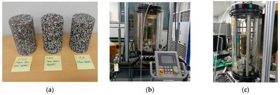 Specimens (a) and dynamic modulus testing setup (b,c).