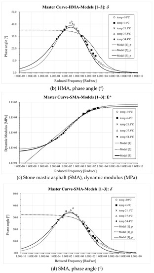 In Equation (5), Eg is the Glassy modulus of asphalt mixture ranging from 42 to 48 GPa [37], while v, w, and tc are fitting parameters. Similar to Equations (2) and (4), the phase angle, δ(ω), can be expressed as:
