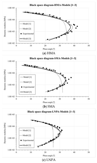 In addition, the black space diagram was generated to further evaluate the difference between the three master curve formulations (Figure 4). Similarly to Figure 3, comparable fitting can be observed for Models 1 and 3. This also supports the application of the Booji and Thoone approximation [34] together with the fitting approach adopted in Equation (7). However, a considerably distinct prediction trend was found when using the CAM model (Model 2) [33]; this largely deviates from the experimental measurements.