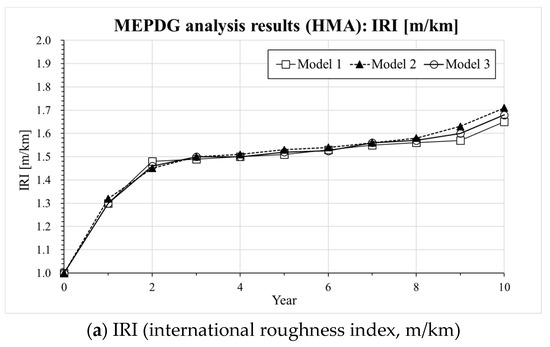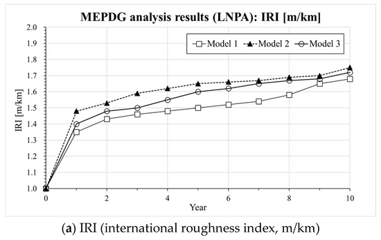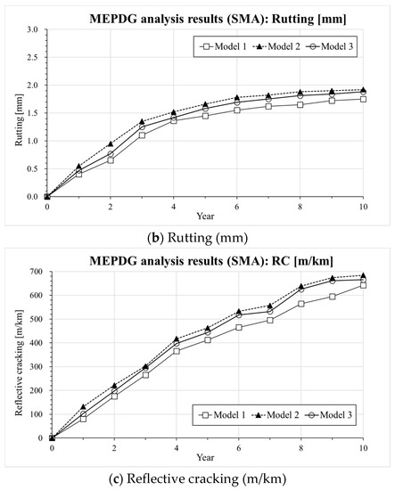 Information on the input parameters and computation assumptions adopted for the MEPDG analysis [30] is shown in Table 5. It should be noticed that the thickness of the pavement layer and the design parameters are set based on the current expressway design guide (e.g., composite pavement design guide written in Korea Expressway Corporation) in South Korea [29]. In the case of LNPA (Mixture 3), only an upper layer with 5 cm thickness is considered while the lower 5 cm asphalt mixture layer consisted of an SMA mixture based on the current composite LNPA design guide in South Korea [29]. Figure 5, Figure 6 and Figure 7 present the results of the MEPDG analysis in terms of IRI, rutting and Reflective Cracking when the three master curves models investigated in the present study are incorporated in the AASHTOWare-Pavement simulation.