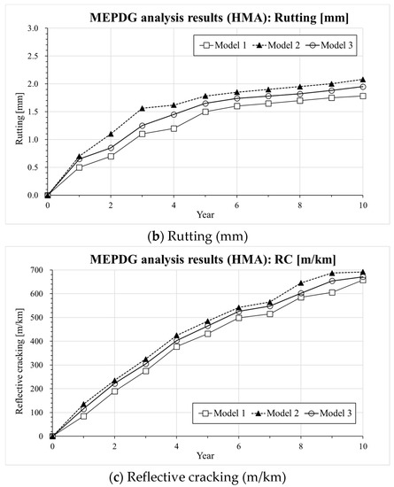 In this paper, three different rheological models including a newly developed formulation based on the current Christensen Anderson and Marateanu (CAM) model, named sigmoidal CAM model (SCM), are used to estimate the evolution of roughness, rutting, and reflective cracking in a typical composite pavement structure currently widely adopted in South Korea. Three different asphalt mixtures were prepared and dynamic modulus tests were performed. Then, the mechanistic-empirical pavement design guide (MEPDG) was used for predicting the progression of the pavement distress and to estimate the effect of the three different models on such phenomena. It is found that the three different mathematical models provide lower and upper limits for roughness, rutting, and reflective cracking. While the CAM model may not be entirely reliable due to its inability in fitting the data in the high-temperature domain, SCM might result in moderately more conservative pavement design.